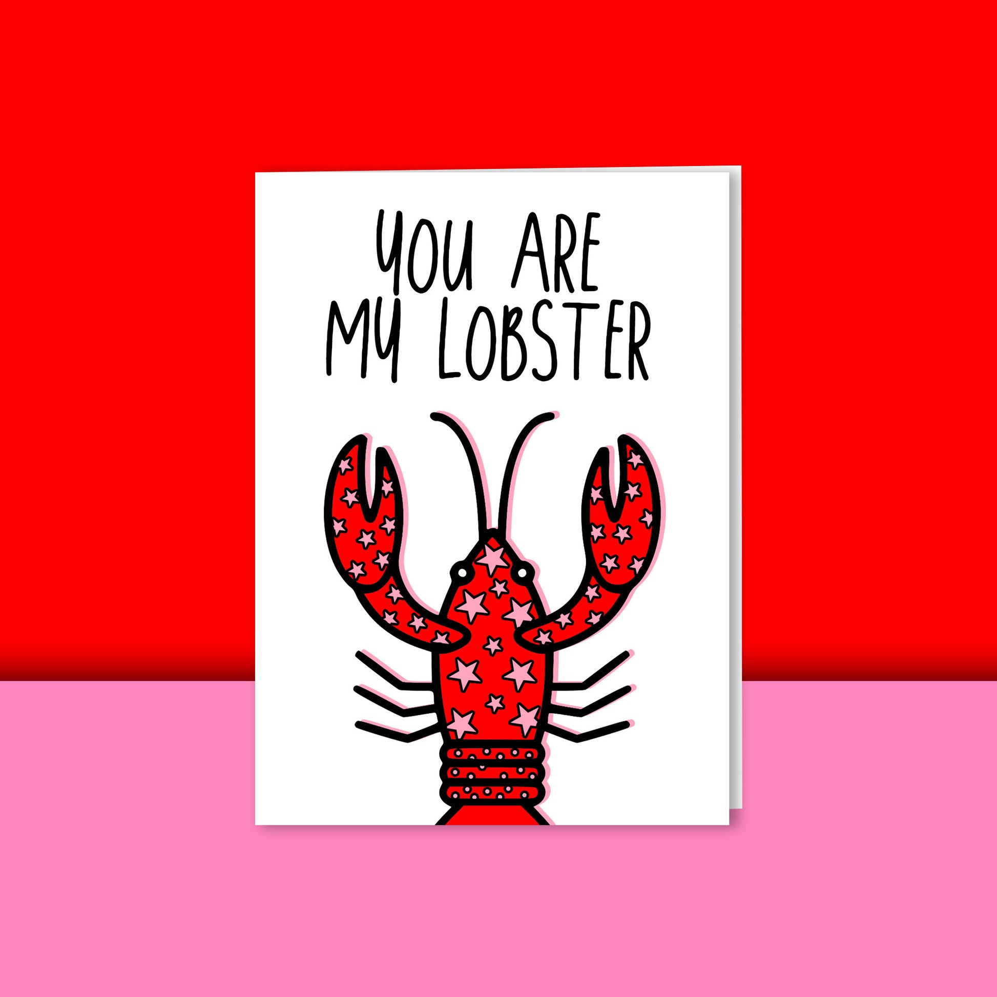 A fun, quirky greetings card featuring a star print lobster illustration and hand lettering. This would be the perfect card to gift your own 'lobster' as a birthday or anniversary card.